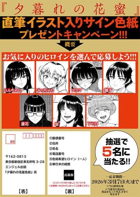 希望するコミックス収録作品のヒロインを一人選んで応募すると、5名様に直筆色紙があたるチャンス★